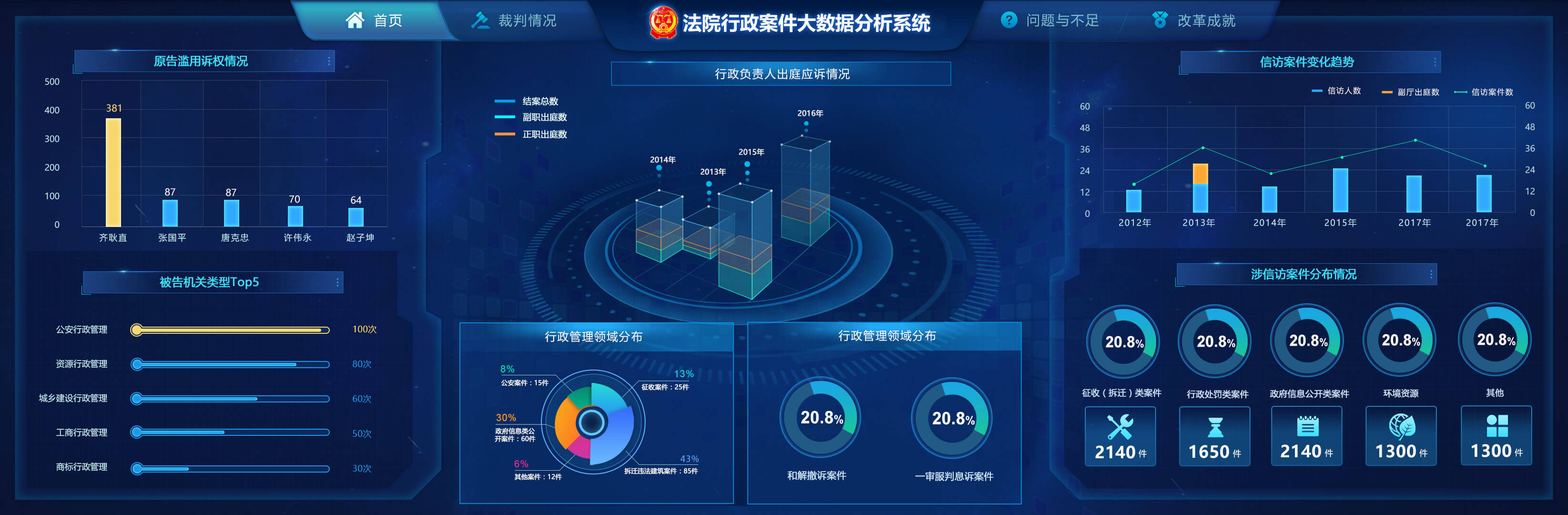 法院行政案件大數(shù)據(jù)分析系統(tǒng)包含了結(jié)案特征分析、當(dāng)事人分析、實(shí)效分析和管轄改革成效。通過收案/結(jié)案的數(shù)量和增幅,分別用時(shí)間、領(lǐng)域、地區(qū)等維度分析案件變化趨勢,從結(jié)構(gòu)方式、矛盾化解情況、重點(diǎn)質(zhì)效指標(biāo)、輿情熱點(diǎn)案件、敗訴案件和敗訴案件信息來分析結(jié)案特征,用信訪案件變化趨勢和分布情況針對機(jī)關(guān)濫用職權(quán)情況來特別分析。不同分析角度分析不同數(shù)據(jù),實(shí)現(xiàn)案件大數(shù)據(jù)全方位解讀。