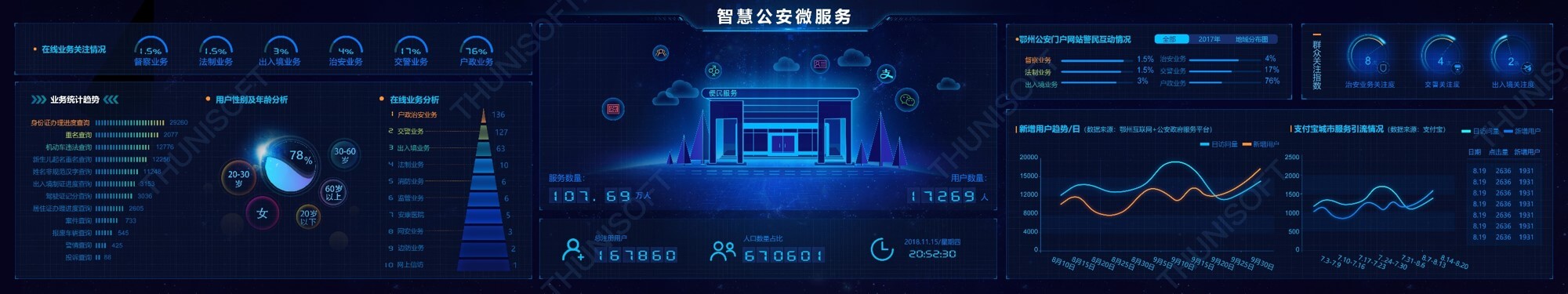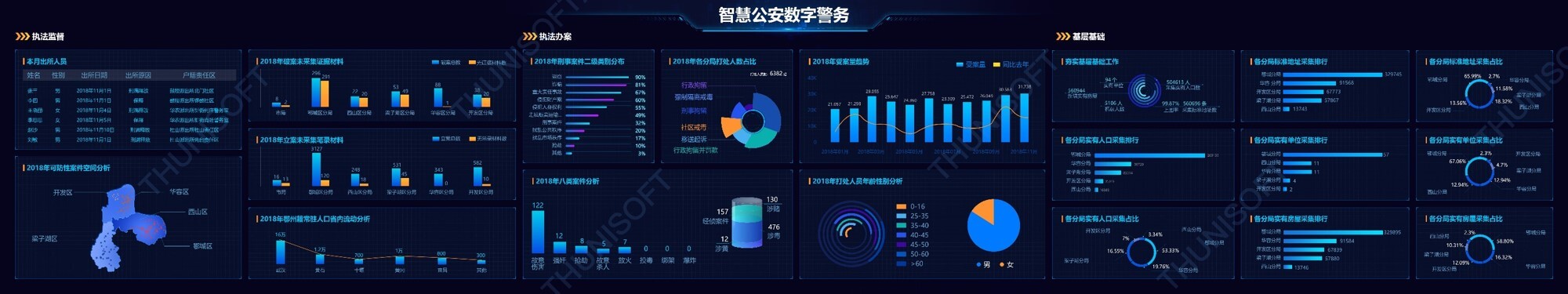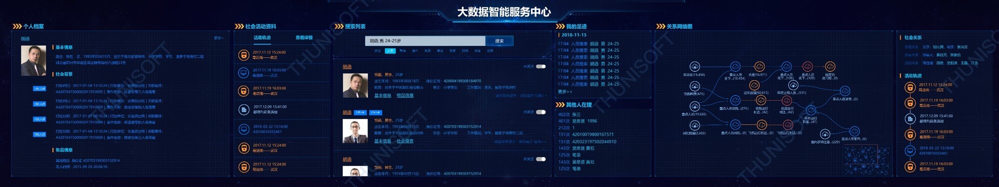 智慧公安實(shí)戰(zhàn)應(yīng)用包括了智慧搜索、智慧建模、智慧服務(wù)、智慧監(jiān)督、智慧標(biāo)簽、智慧小區(qū)、智慧管控以及智慧監(jiān)測,實(shí)現(xiàn)個(gè)人檔案的查詢,同時(shí)關(guān)聯(lián)社會(huì)關(guān)系和活動(dòng)軌跡并繪制出關(guān)系網(wǎng)絡(luò)圖,通過建模顯示各模型使用情況和資源訪問量、訪問趨勢,進(jìn)行在線業(yè)務(wù)分析,各類警務(wù)案件指標(biāo)分析,根據(jù)標(biāo)簽標(biāo)準(zhǔn)生成人員畫像,通過重點(diǎn)人員異常軌跡進(jìn)行警情監(jiān)測,根據(jù)熱點(diǎn)追蹤進(jìn)行傳播路徑分析,實(shí)現(xiàn)公安智慧化管理。