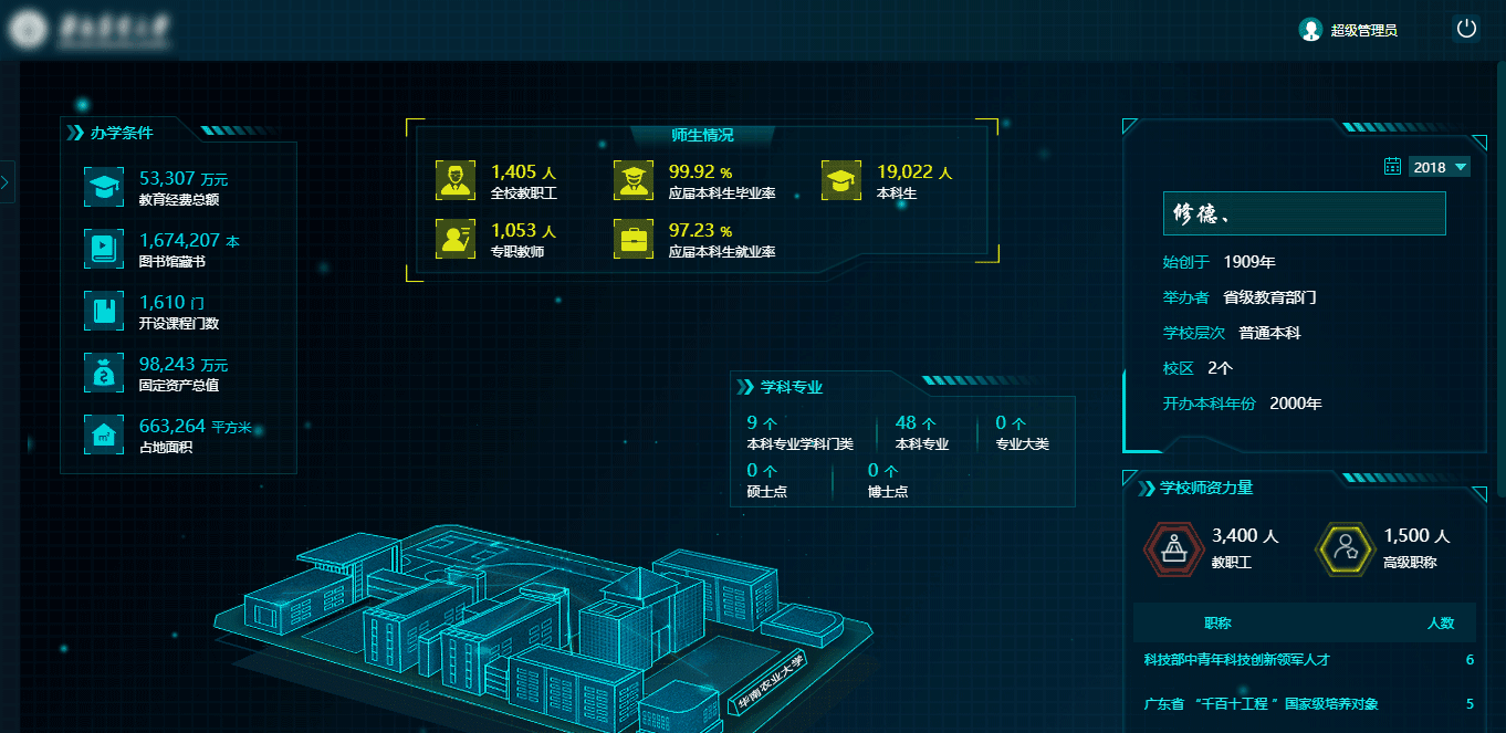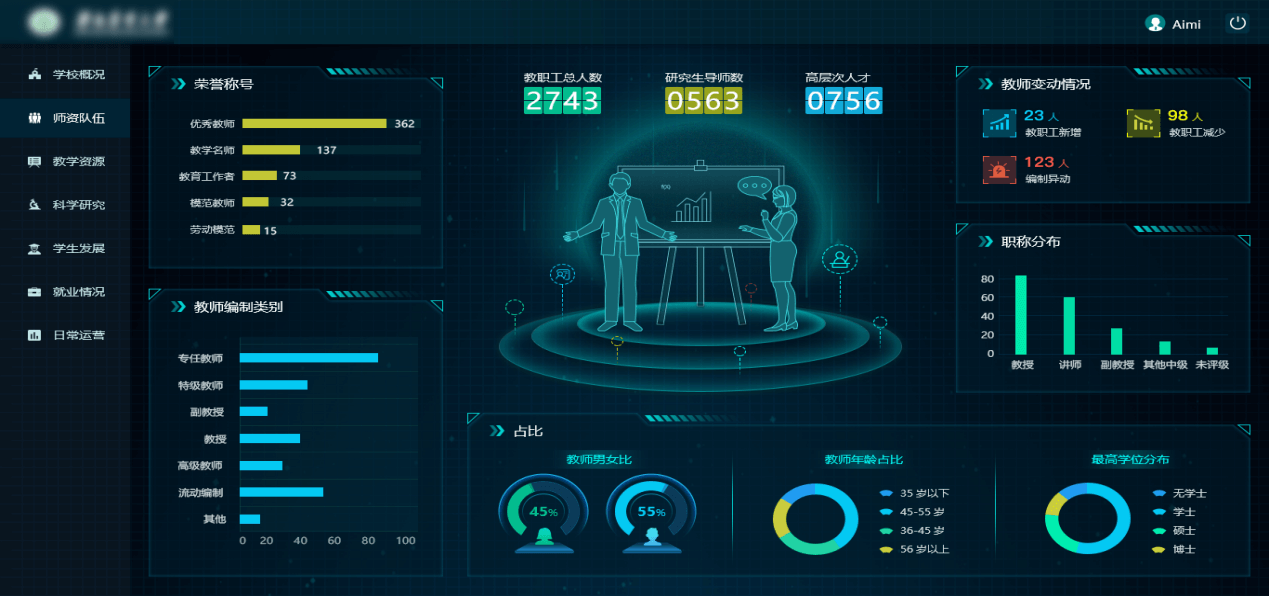 為了展現(xiàn)學(xué)校的實(shí)力,分別從學(xué)校概況、師資隊(duì)伍、教學(xué)資源、科學(xué)研究、學(xué)生發(fā)展、就業(yè)情況和日常運(yùn)營的角度來展示。學(xué)校概況包括辦學(xué)條件、師生情況、學(xué)科專業(yè)和師資力量,再通過榮譽(yù)稱號、教師編制類別、教職工人數(shù)、研究生導(dǎo)師數(shù)、高層次人才、職稱分布、最高學(xué)位分布等展示師資隊(duì)伍,用教學(xué)用房面積、教學(xué)經(jīng)費(fèi)投入、教學(xué)科研儀器、圖書資料等來表現(xiàn)教學(xué)資源,用著作成果、獲獎(jiǎng)成果、論文與專利等展現(xiàn)科學(xué)研究。