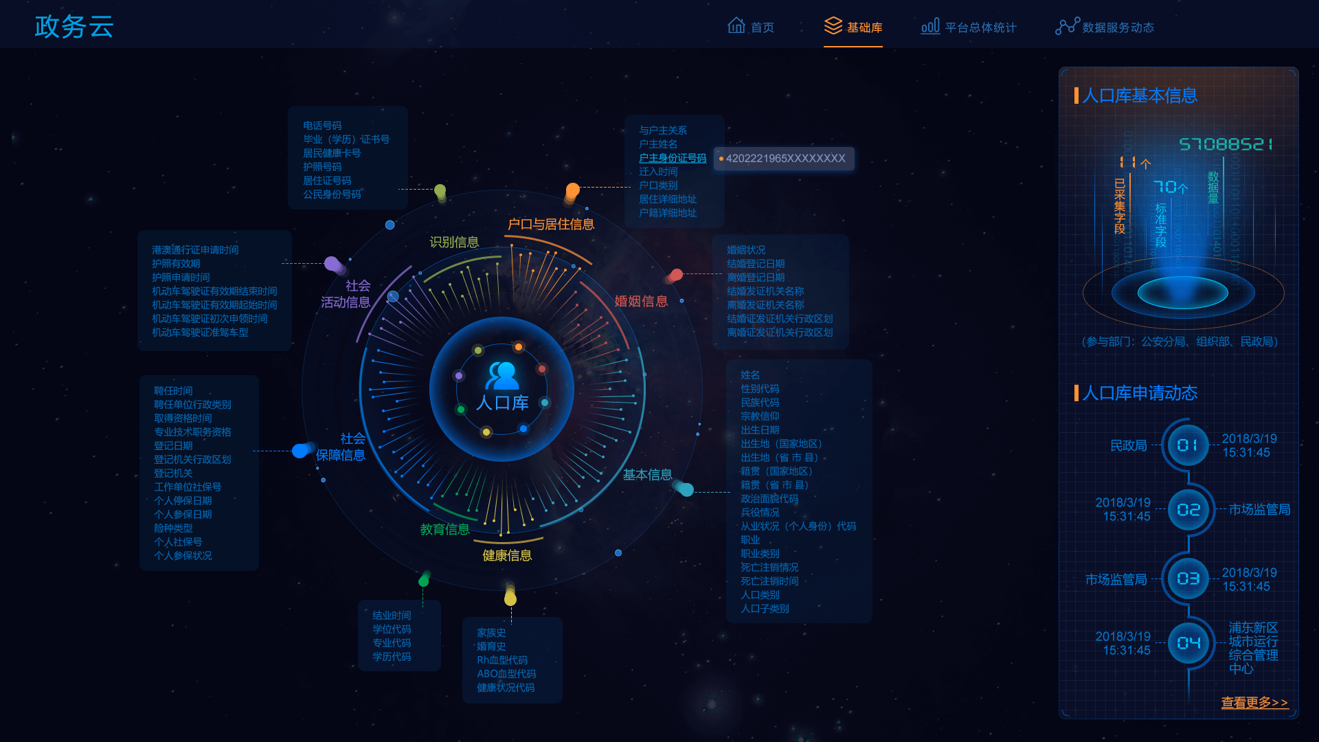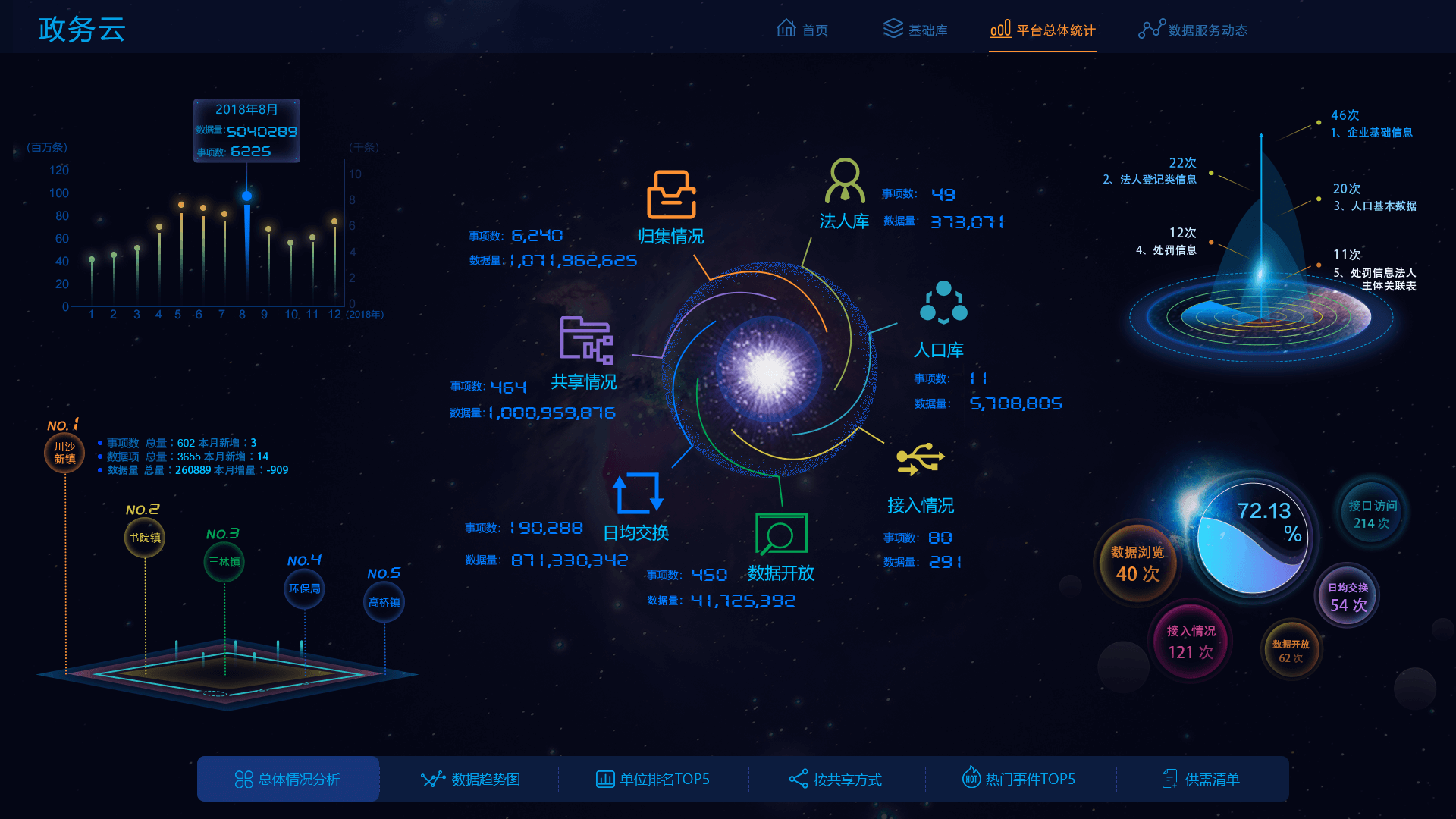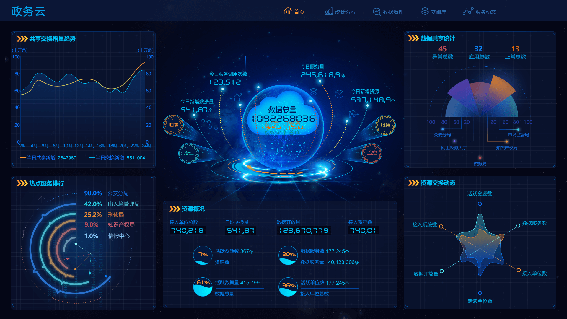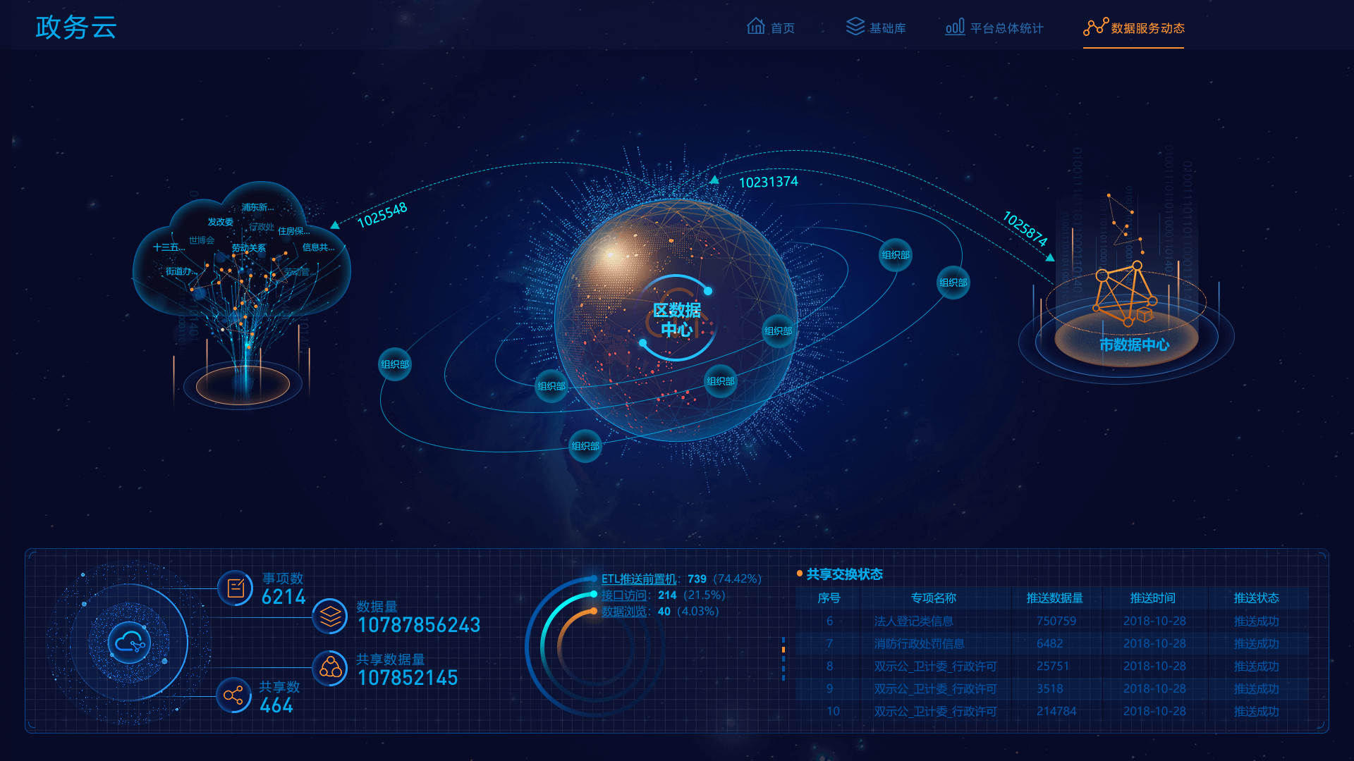 首頁展示共享方式占比、共享屬性占比、數(shù)據(jù)趨勢、熱門事項(xiàng)、和單位排名等,基礎(chǔ)庫包括人口庫、法人庫,支持搜索刷新,同時(shí)展示庫的基本信息和申請動(dòng)態(tài),平臺總體統(tǒng)計(jì)展示平臺各類指標(biāo)數(shù)據(jù)的訪問、更新情況,數(shù)據(jù)服務(wù)動(dòng)態(tài)展現(xiàn)區(qū)數(shù)據(jù)中心和市數(shù)據(jù)中心等的數(shù)據(jù)實(shí)時(shí)交互狀況,實(shí)現(xiàn)數(shù)據(jù)全方位全時(shí)段把控。