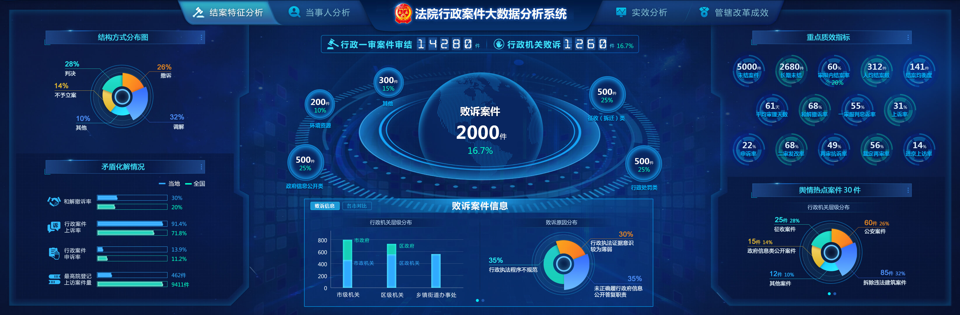 法院行政案件大數(shù)據(jù)分析系統(tǒng)包含了結(jié)案特征分析、當(dāng)事人分析、實(shí)效分析和管轄改革成效。通過收案/結(jié)案的數(shù)量和增幅,分別用時(shí)間、領(lǐng)域、地區(qū)等維度分析案件變化趨勢,從結(jié)構(gòu)方式、矛盾化解情況、重點(diǎn)質(zhì)效指標(biāo)、輿情熱點(diǎn)案件、敗訴案件和敗訴案件信息來分析結(jié)案特征,用信訪案件變化趨勢和分布情況針對機(jī)關(guān)濫用職權(quán)情況來特別分析。不同分析角度分析不同數(shù)據(jù),實(shí)現(xiàn)案件大數(shù)據(jù)全方位解讀。